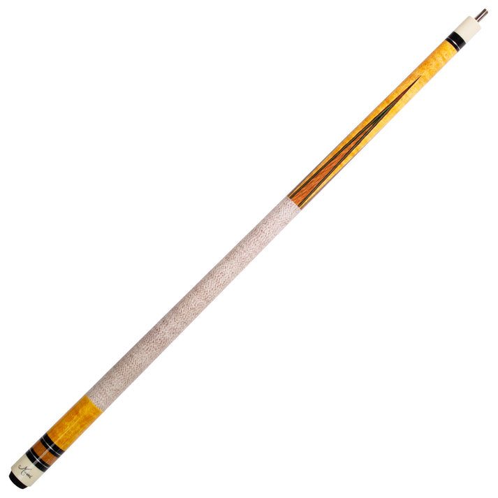 Step up your pool game with the Meucci ECHO-1 Pool Cue. The elegant honey-stained Curly Maple design features four Tulipwood points with green, brown, and gray veneers. The 29" "The Pro" Wood Shaft with a 12.5mm diameter and Ultraskin Black tip ensure precision and control. The urethane coated Irish Linen wrap adds a touch of luxury to your game.