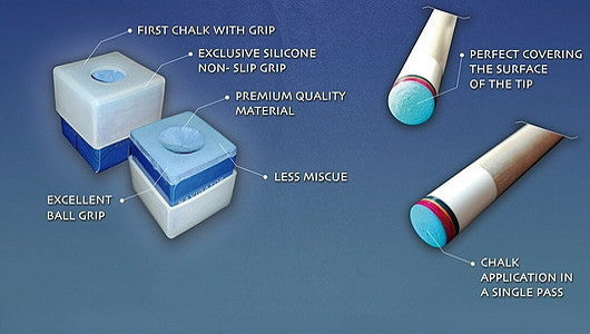designed to offer more grip on the ball to give you that extra needed spin and control without leaving the cue ball marked up.  Also doesn't leave chalk residue on the table.  Sold by the cube and is standard pool cue cube size.  Chalk comes in a factory sealed package and has a a silicon cover.  Only available in blue.